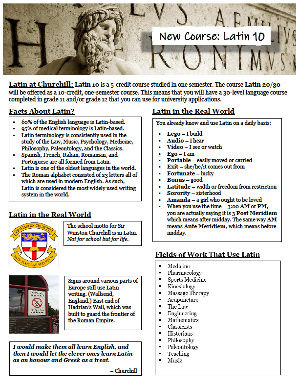 Students enrolled in Latin 20 will continue their study of the Latin language. A more detailed emphasis will be placed upon Latin vocabulary, grammar, and syntax, with a greater range of linguistic, political, and historical understanding of Ancient Rome (Caesar’s time and history, the Roman army and the populous). Students will also continue their reading and study of Greek and Roman Mythology.